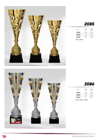 2085 height diameter Art. No. (cm) (cm) 2085A 54 19,5 2085B 48 17,5 2085C 43 16,5 metal / plastic 2086 height diameter Art. No. (cm) (cm) 2086A 54 19,5 2086B 48 17,5 2086C 42 16,5 metal / plastic / marble 16 Plates and emblems are not included.