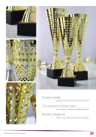 Unique design Designer cup with minimalist openwork details. Two options in three sizes Tall and heavy — perfect for prestigious events. Modern elegance Black marble base adds elegance and weight. Plates and emblems are not included. 21