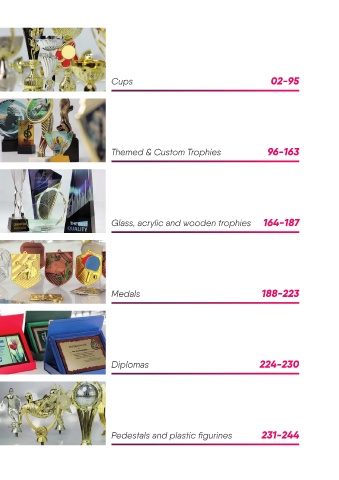 Cups 02-95 Themed & Custom Trophies 96-163 Glass, acrylic and wooden trophies 164-187 Medals 188-223 Diplomas 224-230 Pedestals and plastic figurines 231-244