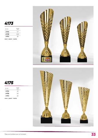4173 height Art. No. (cm) 4173A 47 4173B 43,5 4173C 36 metal / plastic / marble 4175 height Art. No. (cm) 4175A 45 4175B 40 4175C 35 metal / plastic / marble Plates and emblems are not included. 33