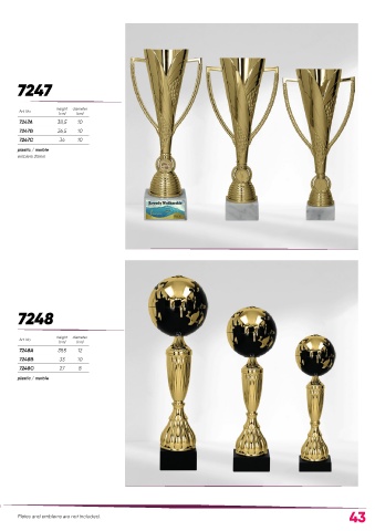 7247 Art. No. height diameter (cm) (cm) 7247A 38,5 10 7247B 36,5 10 7247C 34 10 plastic / marble emblem 25mm 7248 height diameter Art. No. (cm) (cm) 7248A 39,5 12 7248B 33 10 7248C 27 8 plastic / marble Plates and emblems are not included. 43